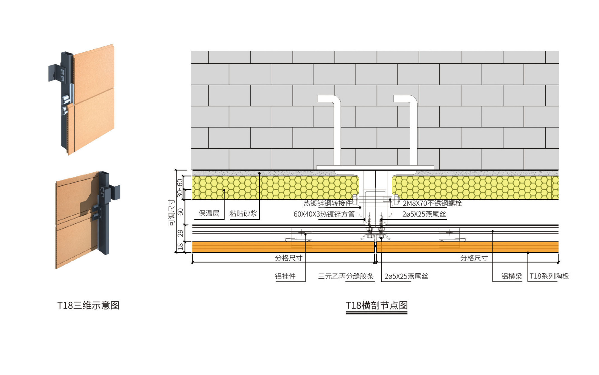 18mm陶板的尺寸各個廠家亦不一致,并且在安裝時其兩個T型槽的中心距亦不相等,主要有96mm、66(67)mm兩種。在選用掛件及確定橫龍骨位置時,要注意這個問題。